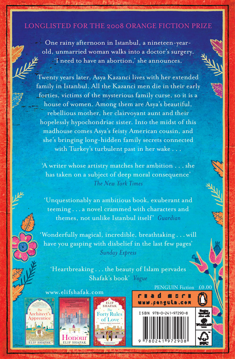 In a better world, Turkish writer Elif Shafak would get more attention for her zesty, imaginative writing and less for the controversy politics stir up. A lively look at conteporary Istanbul and family through the eye sof two young women, one Turkish and one Armenian American.